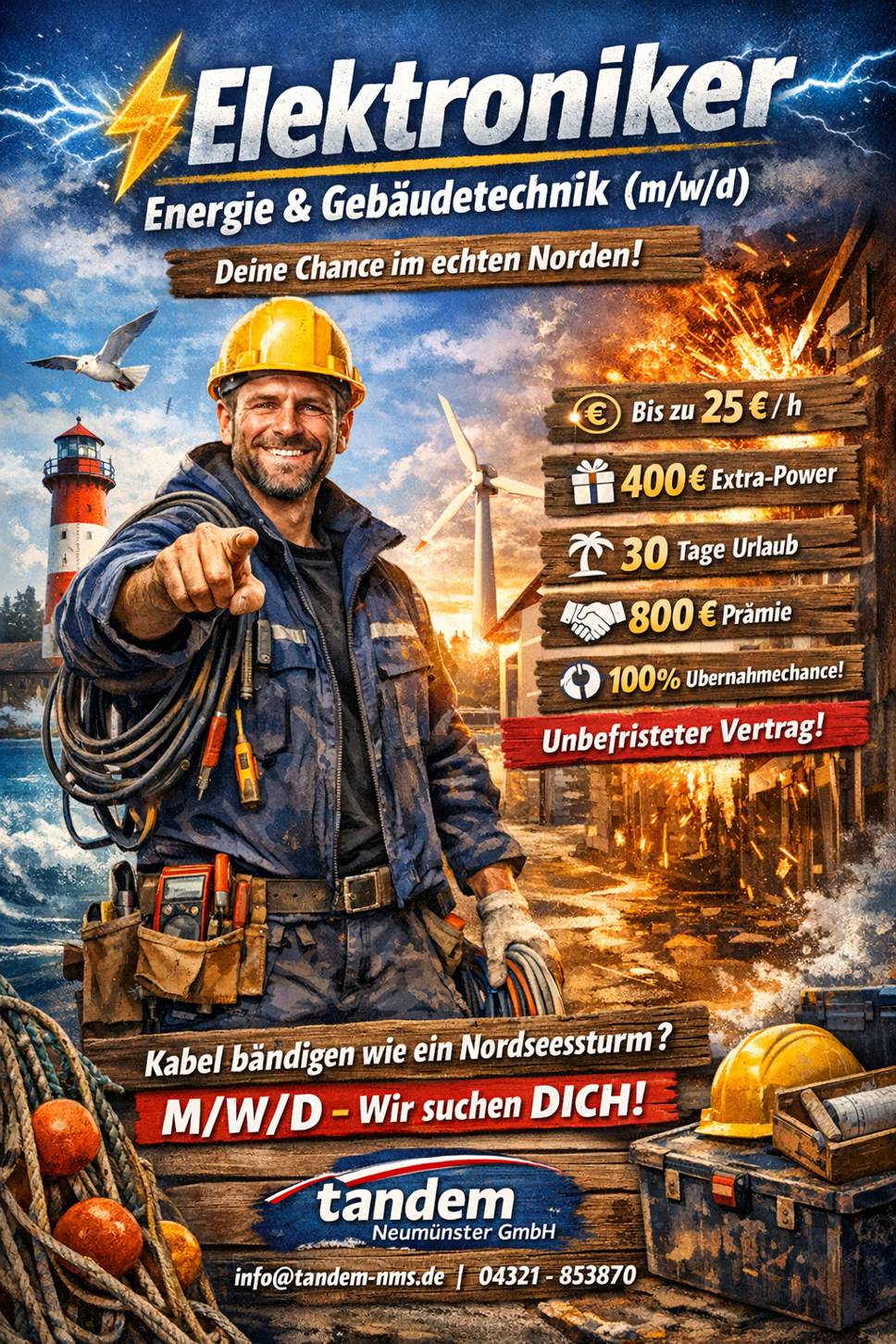 Wir sind DER Personaldienstleister aus Neumünster. Direkt. Ehrlich. Norddeutsch. Und wir suchen für unsere Kunden Leute, die nicht nur Kabel anfassen – sondern Energie beherrschen.