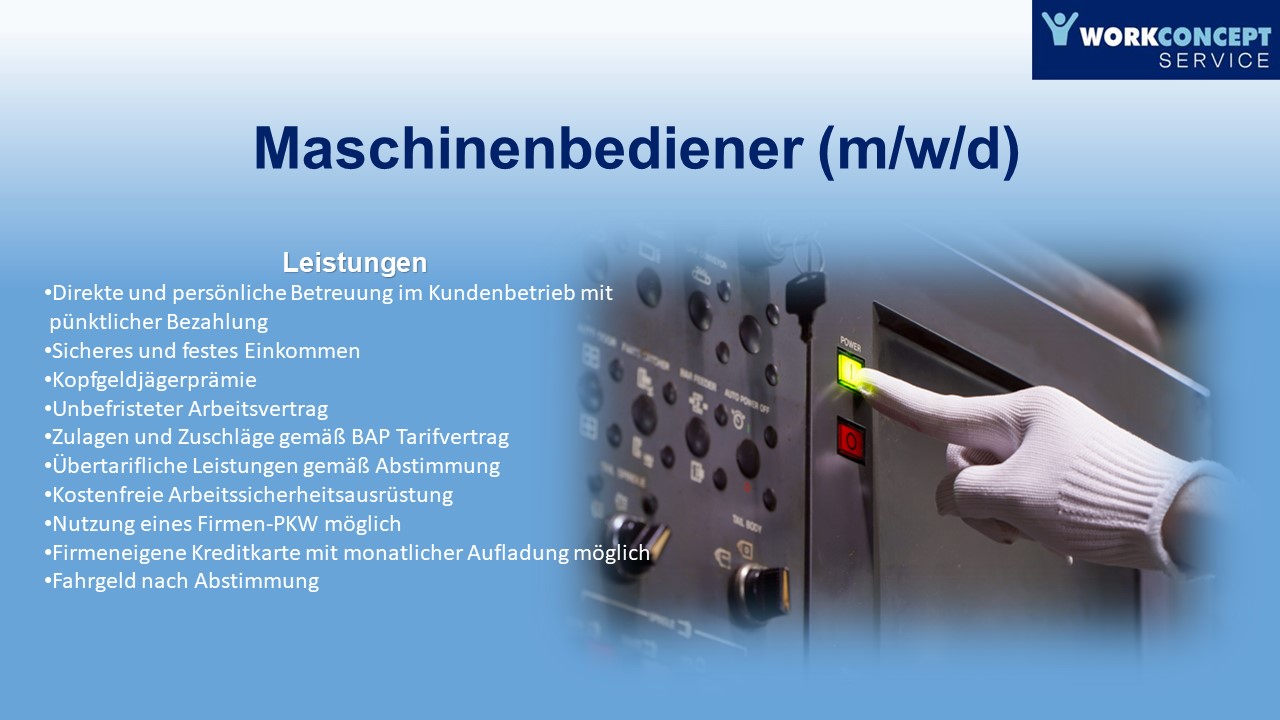 Seit Mitte 2012 agieren wir, die workconcept service GmbH, erfolgreich als regionaler Dienstleister in Mitteldeutschland. Unsere Aufgabe ist es unsere Bewerber, in allen beruflichen Belangen und Wünschen zu unterstützen. Durch unsere Erfahrungen und Kontakte sind wir in der Lage, schnell und unkompliziert eine, für Sie, passende Arbeitsstelle zu finden.