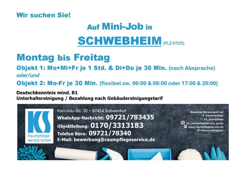 Objekt 1: Mo+Mi+Fr je 1 Std. & Di+Do je 0,5 Std. (flexibel / Arbeitszeit nach Absprache)